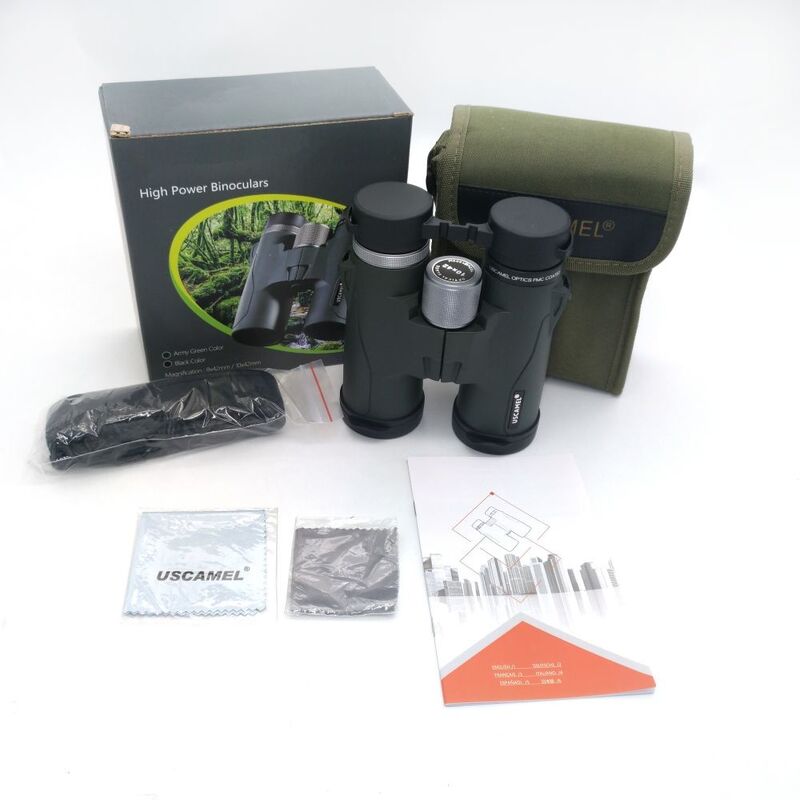 1. HD 10X42 Binoculars , Eyepiece Lens Cap, Objective Lens Caps, hand Strap, Hard Case with Carrying Strap, Soft Cleaning Cloth, Color box, and Instructions.